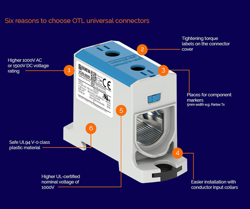 Use: OTL universal connectors are used for the branching and connecting aluminium and copper cables. These small modules offer high power connections for the EV charging, Solar and Windfarm applications as well as many other uses.