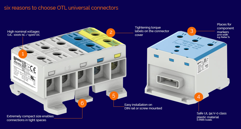 Use: OTL universal connectors are used for the branching and connecting aluminium and copper cables. These small modules offer high power connections for the EV charging, Solar and Windfarm applications as well as many other uses.