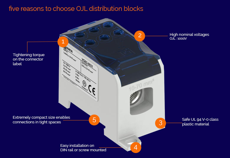 General: OJL distribution blocks offer the highest quality product with additional features that increase the safety and ease of installation of the connectors and enable versatile end usage applications. Pre-greased contact spaces and the connection completed with hex screws guarantee easy and quick installation. The compact size of the connectors ensures efficient use of space even in tighter installation spaces.