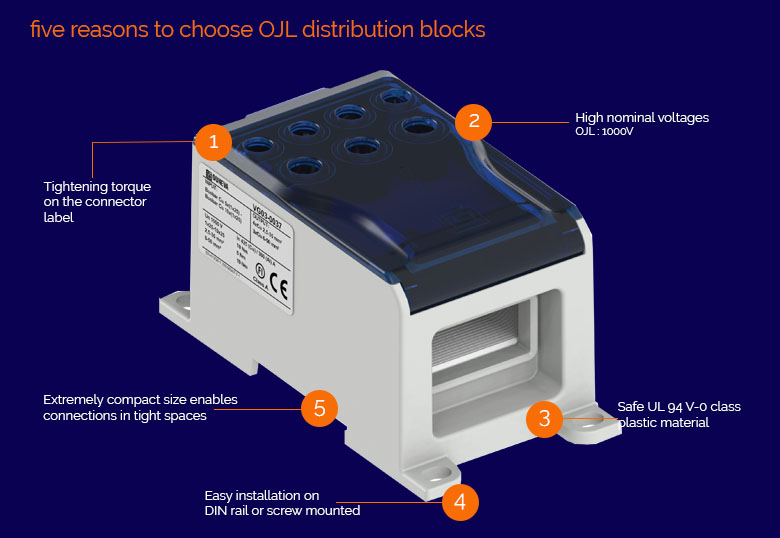 General: OJL distribution blocks offer the highest quality product with additional features that increase the safety and ease of installation of the connectors and enable versatile end usage applications. Pre-greased contact spaces and the connection completed with hex screws guarantee easy and quick installation. The compact size of the connectors ensures efficient use of space even in tighter installation spaces.