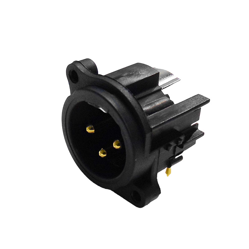 This high quality 3 pin panel mount XLR socket features a round plastic shell constructed from PA-6 glass fibre reinforced material, providing outstanding mechanical strength, dimensional stability, and long-term durability. Designed with right-angle pins for direct PCB mounting, it offers a compact and reliable interconnect solution for space constrained applications.