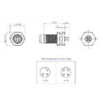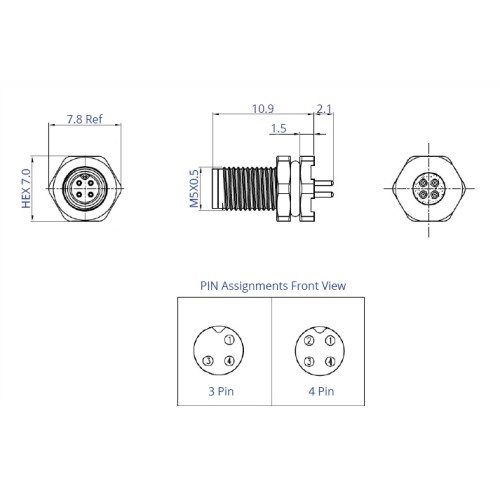 The CC05-XXP-FA-PB is an M5 front fastening panel mounted plug. This circular connector has an A coding, with the option of a 3 or 4 way pin assignment, with PCB through hole pins. The IP67 waterproof rating and screw lock nature of the M-series connectors provide a robust and secure connection and with an overall diameter of 7.8mm maximum, the M5 connectors provide a small and discrete connection option for