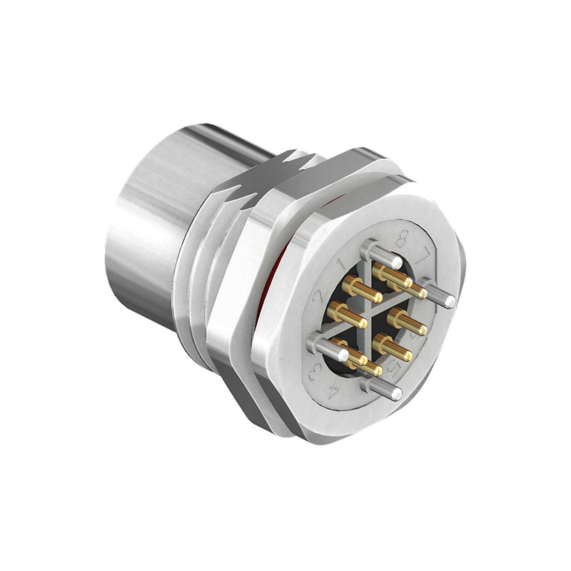 The CC12-08S-FX-PBSX is an M12 circular socket connector which is available with 8 pins and a shielding pin in an X coding format. The connector features straight pins to the rear for mounting directly to a PCB. The panel lock thread for the connector can also be in a PG9 or M16 sizing. The M12 connectors are designed for use in industrial applications and feature a small and robust design which has a waterproof rating to IP67, which protects your equipment from entry of water or dust into your system.