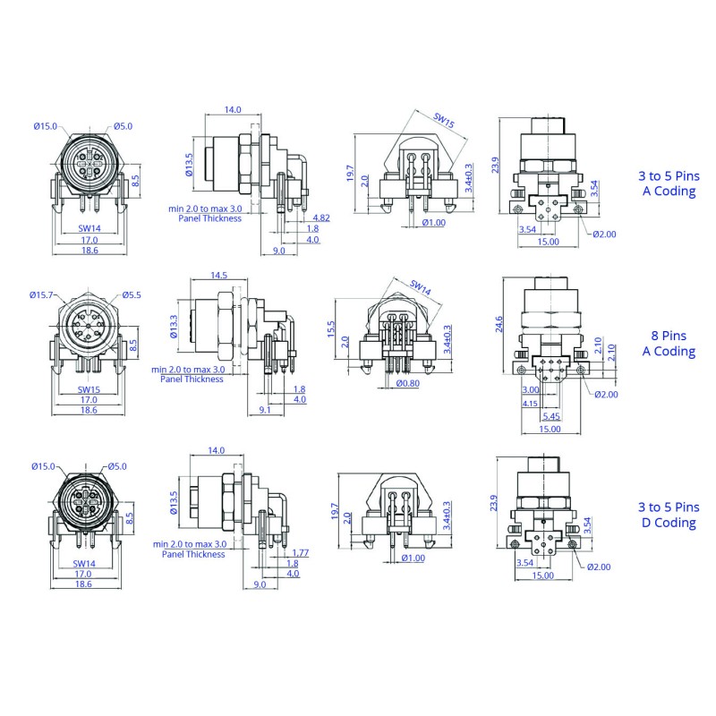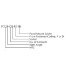 The CC12-XXS-FX-PB is a right angle M12 circular socket designed for mounting directly onto a PCB. It is available in an A or D coding with 3, 4, 5 and 8 pins. The connector has integrated PCB support points for holding into the board for precise location prior to soldering. The connectors have a front fastening nut for mounting onto an equipment panel of between 2 and 3mm in thickness.