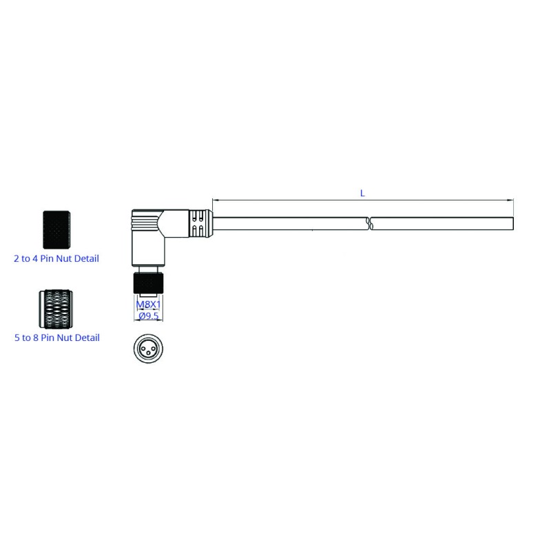 The SCM08-XXSXRS-XXXX is an M8 shielded right angle over-moulded socket cable assembly with a stub end for completion with a termination of your choice. The M8 socket is available in an A or B coding with 2 to 8 pin options. The cable is available in standard lengths of 0.5, 1, 1.5 and 2 metres, but we can offer a bespoke cable assembly to any length and with any termination.