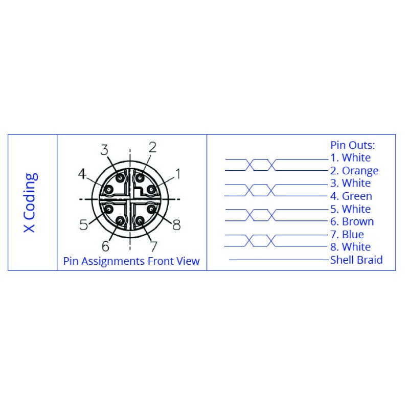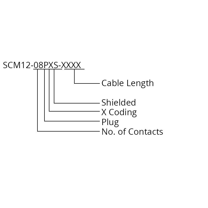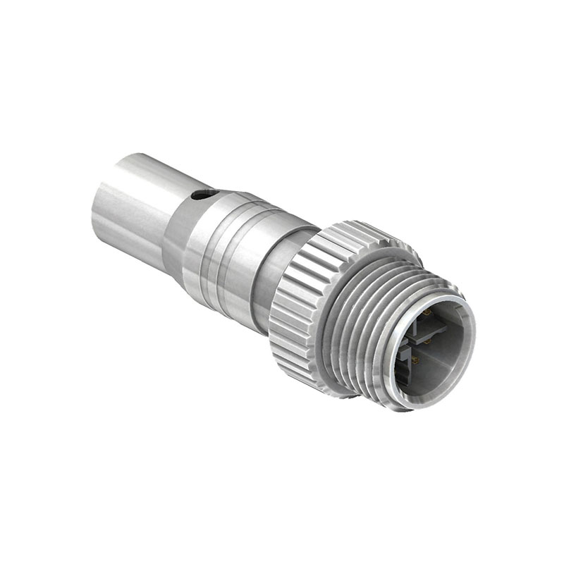 The CC12-08P-X-MMS is an M12 circular moulded plug connector which has 8 pins in an X coding. The connector has a shielding pin and features solder terminals to the rear for cable mounting. The connector can be sold as a stand alone connector or as part of a standard cable assembly with overmoulding (part number SCM12-08PXS-XXXXA) or a bespoke cable assembly with mixed termination styles to the other end.