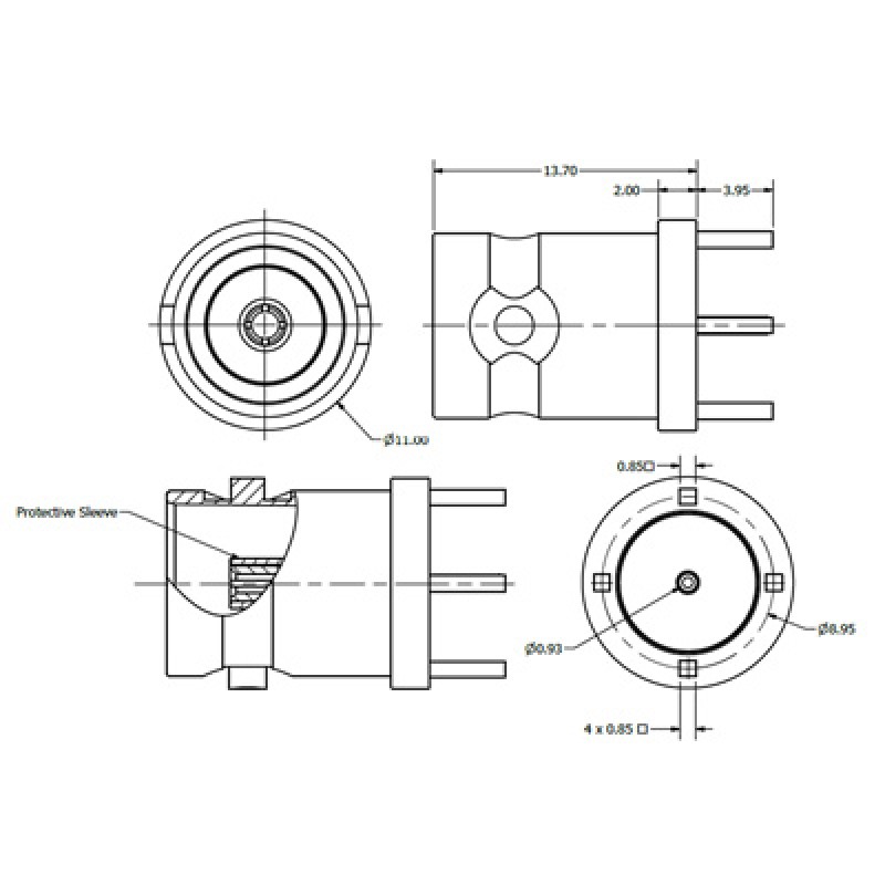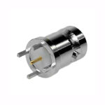 The XBS-03-TE39-NNU Precision 75Ω BNC top entry PCB mounted connector with a protective insulator sleeve around the centre contact. The centre contact is a thickness of 0.93mm.