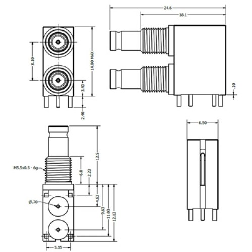 The XGS-06-RB24-GGD precision 75Ω 1.0/2.3 dual port right angle PCB mounted connector is designed for Multi Layer PCB applications which require a shorter leg length of 2.4mm. The connectors offers the full DIN 1.0/2.3 frequency of 6GHz.