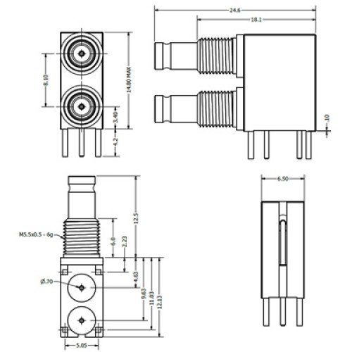 The XGS-06-RB42-GGD is a dual port right angle PCB bulkhead mounted connector which conforms to the standard of SMPTE ST 2081-1 and CXP-6, allowing bit-rates of 5.94Gbit/s over a single coaxial connection. The connector is designed for Multi Layer PCB applications which require a leg length of 4.2mm.